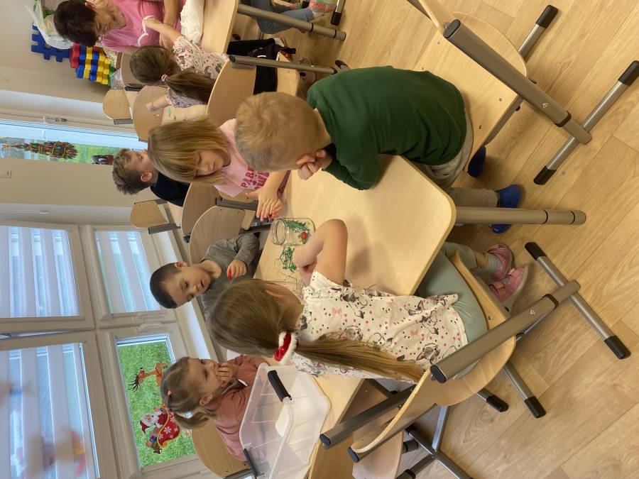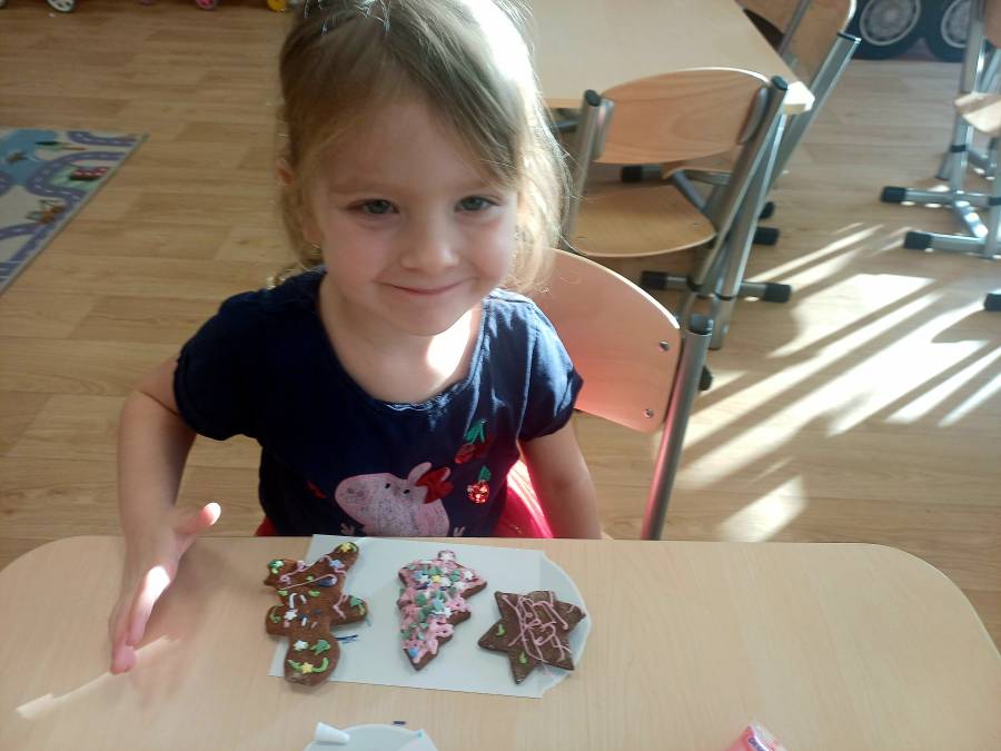 Dzieci wraz z Panią z radością czytały bajkę o elfach, a następnie wspólnie piekły pachnące pierniczki. Zajęcia sprzyjały rozwijaniu wyobraźni, samodzielności oraz umiejętności współpracy w grupie.