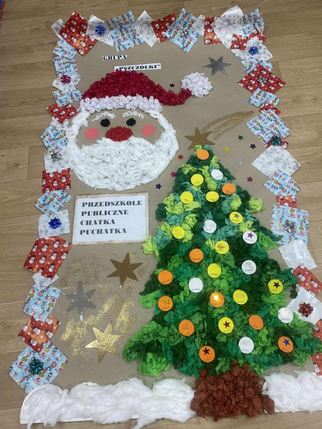 Na podstawie książki pt. ?Pierwsza gwiazda Świętego Mikołaja? dzieci wykonały wspólną pracę plastyczną na brystolu, przedstawiającą Świętego Mikołaja. Działanie to sprzyjało integracji grupy oraz rozwijaniu kreatywności i ekspresji plastycznej dzieci.